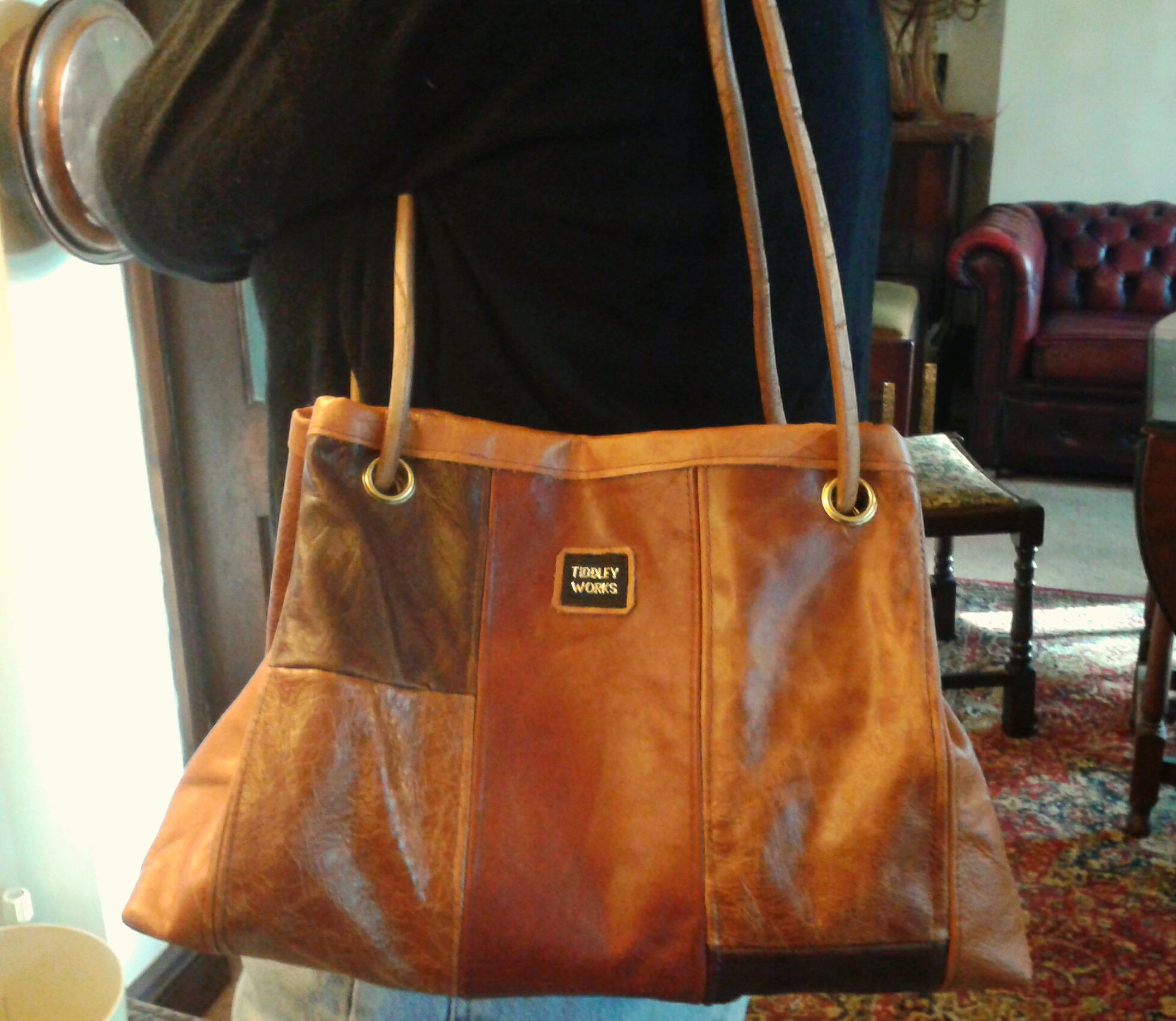 Revised design red and tan TiddleybagCross keyring – hand tied leather cordSome Tiddleyworks leather creationsDragonfly keyring – hand tied leather cordTiddleyowl – Harris tweed with leatherOne of the first bags. made for saleCarpet bag in blue floral tapestry with leather handle and trimThe very first bag that started it all